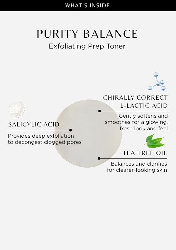 Balance your complexion and clear away impurities with Purity Balance Exfoliating Prep Toner. Packed with salicylic and lactic acids, tea tree oil and niacinamide, this toner exfoliates and deeply cleans pores without being harsh. Washing our face can throw off the pH of our skin, but this amazing toner helps restore balance and remove oil and impurities. Purity Balance does more than a regular toner; it refreshes your skin, leaving you with a healthy, glowing complexion.
