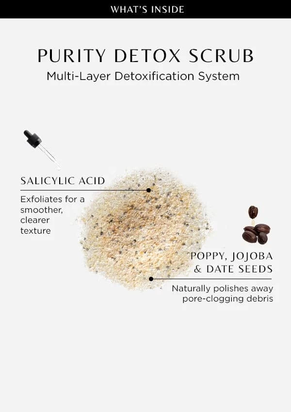Purity Detox Scrub is a customizable Multi-Layer Detoxification System with Salicylic Acid that gently cleanses and exfoliates skin on the face and body to help reveal smoother, clearer-looking skin.