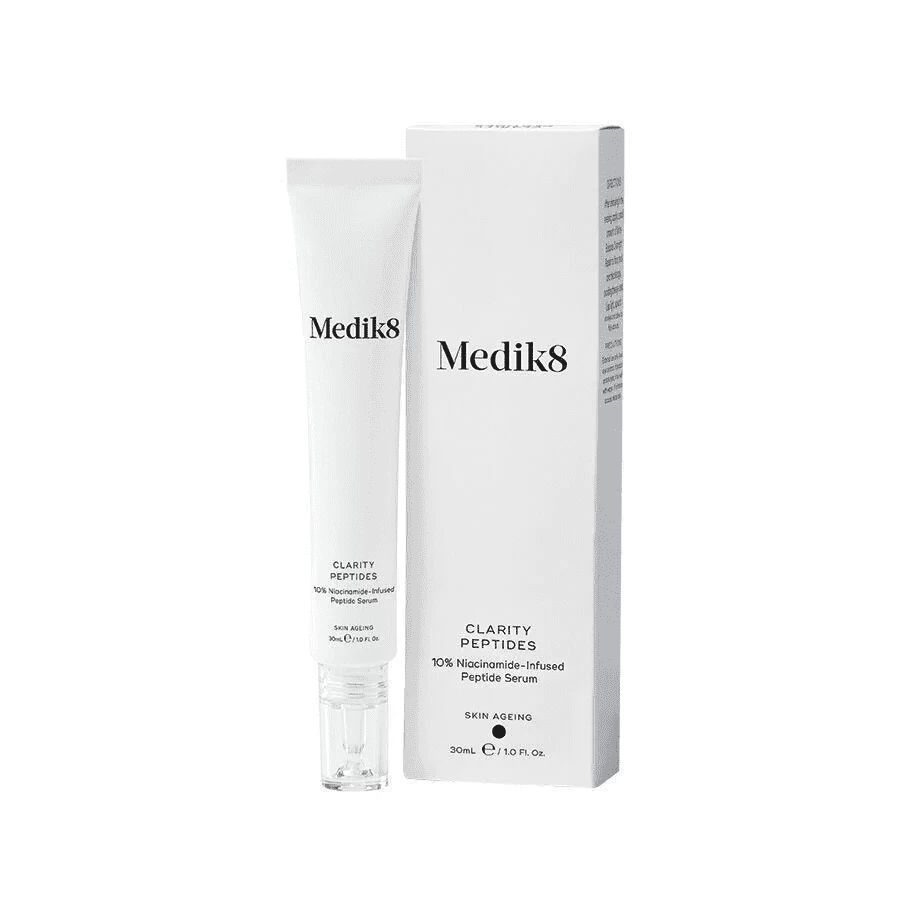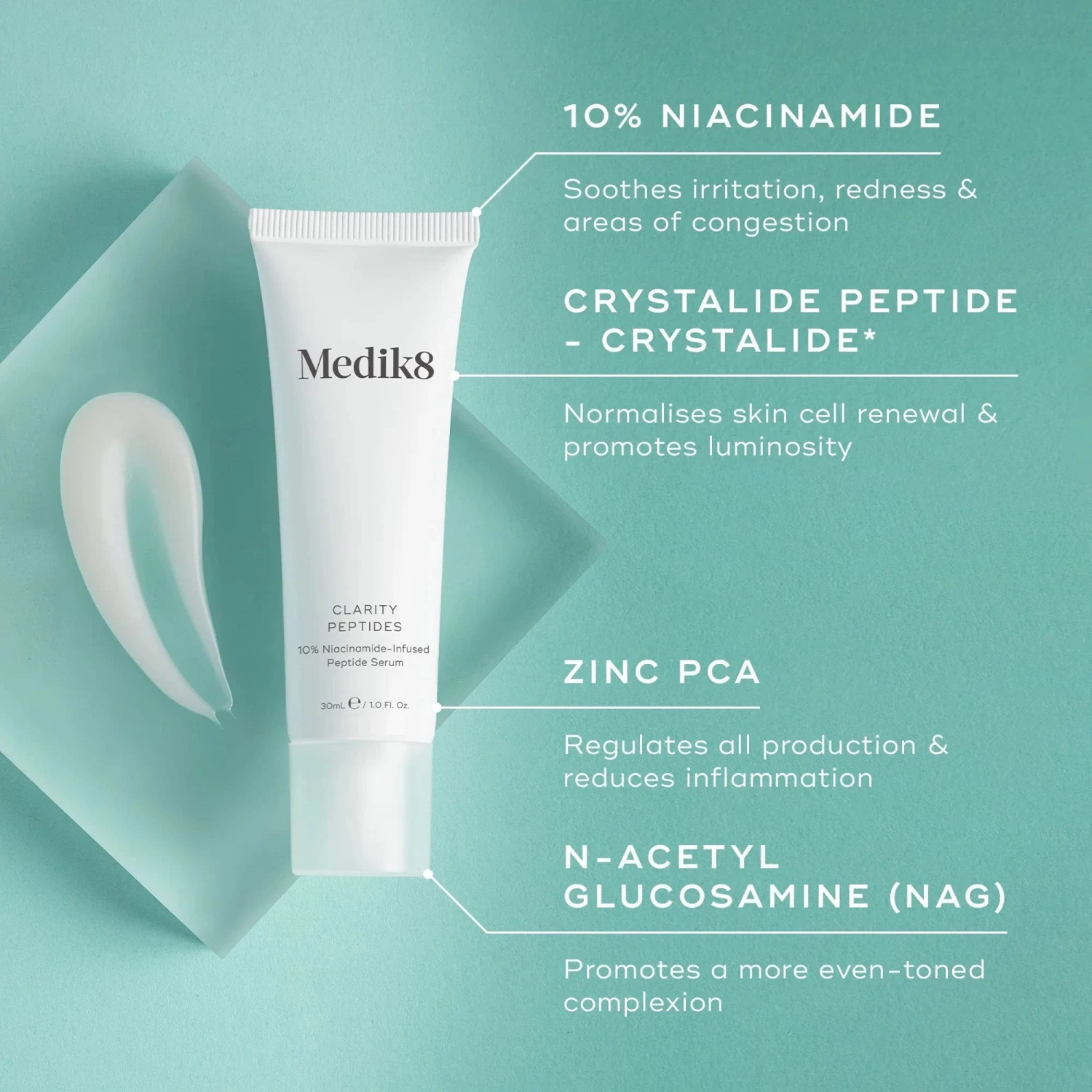 INTRODUCING…CLARITY PEPTIDES. Do you want crystal clear skin? Our latest innovation, Clarity Peptides, with a massive 10% niacinamide can help you achieve just that. We all know that life can get in the way of perfect skin. Whether it be down to stress, diet or lack of sleep, our skin can be affected and left prone to blemishes. Medik8’s Clarity Peptides is perfecting milky serum which promotes visibly clear, glass-like skin when you need it most.