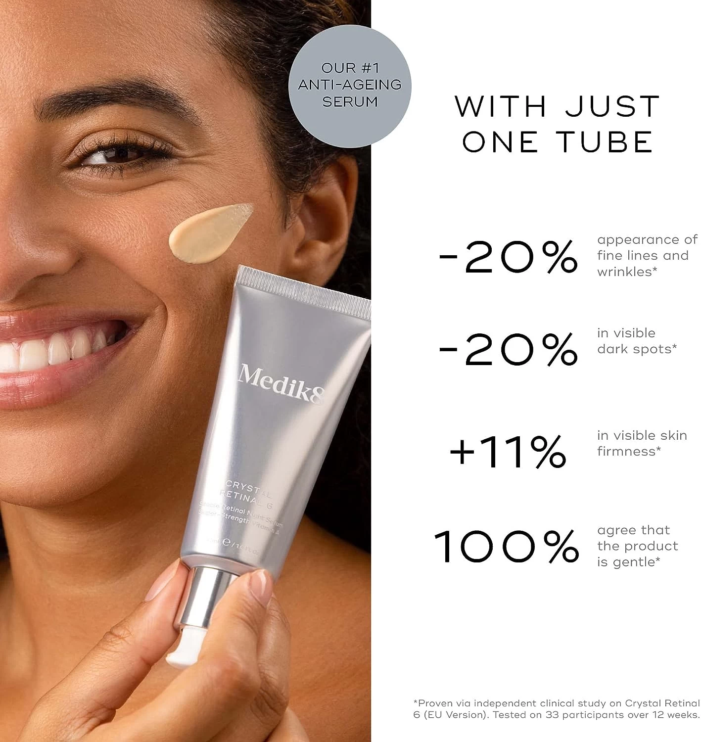 Just one tube of Medik8 Crystal Retinal 6 visibly reduces wrinkles, hyperpigmentation, increases skin firmness and leaves skin brighter and smoother!