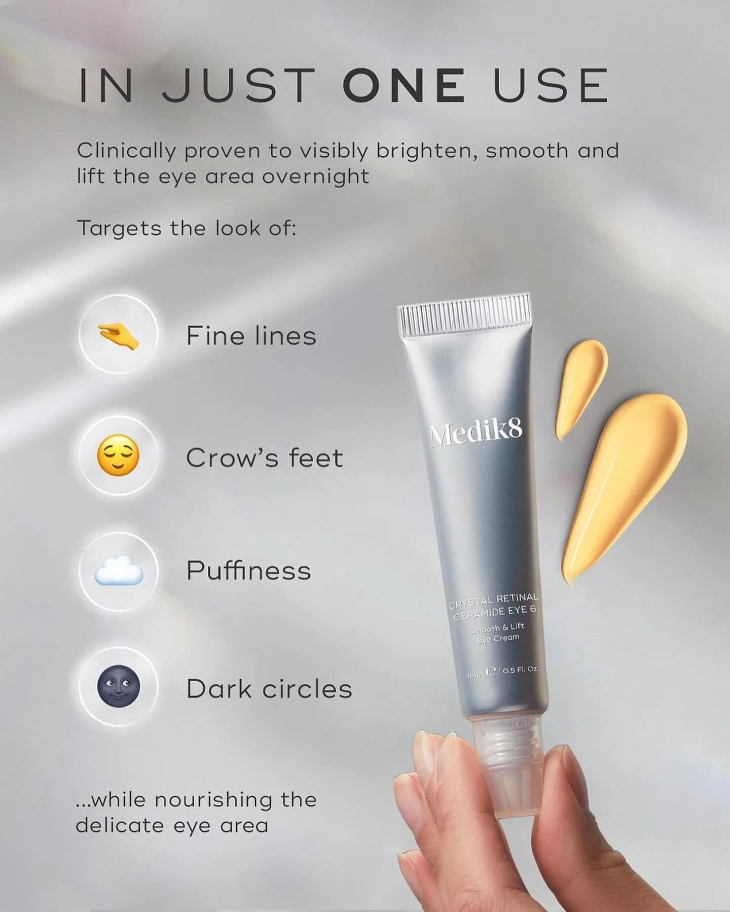 Experience an unparalleled transformation in the appearance of your eyes with Medik8’s new Crystal Retinal Ceramide Eye 10, a 15ml gentle-release, vitamin A-infused eye cream. Meticulously designed to counteract the visible signs of ageing, this luxurious, lightweight formula starts working overnight to restore a youthful appearance. With stabilised retinaldehyde that is optimised for the delicate eye area, and clinical evidence demonstrating its efficacy, discover an impressive visible result that is intensified over time. For all-night hydration and smooth, lifted contours, conjure up a captivatingly youthful look with Medik8’s Crystal Retinal Ceramide Eye 10.